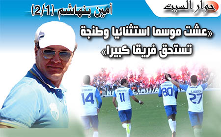 قـال أمين بنهاشم، مُدرب اتّحـاد طنْجَة لكُرة القَدم ، إنّ الصُعـود مع اتّحـاد طنْجَـة لكرة القــدم إلى القسم الأول سيبقى من أعز الذكريات والإنجازات التي سيدونها بمداد الفخر والاعتزاز في سجله الرياضي، سيما أنه رسم البسمة في وجوه جمهور عزيز عليه أهدته تيفو سيظل خالدا في ذاكرته الرياضية وفي قلبه.