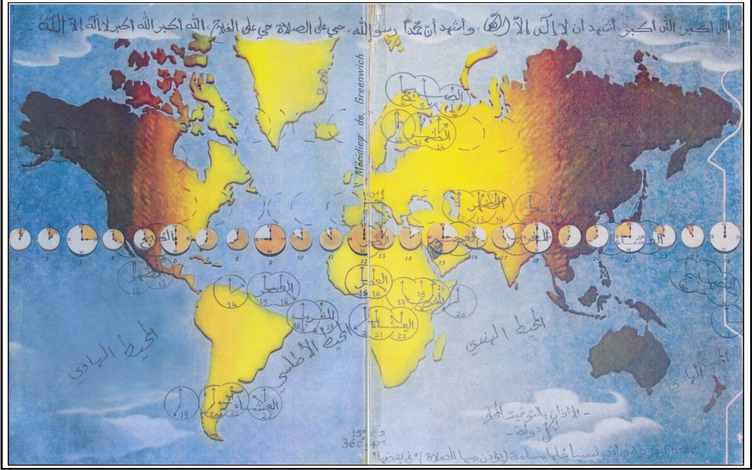 فحينما يُؤذن لصلاة العصْر(الصلاة الوُسْطى) في مَكة المُكرَّمة مركز الكرة الأرضية (وهي الأولى بالتوقيت العالمي من خط كرينيش الوهمي) وقِبْلة المُسلمين، هذا الحدث في الزمان والمكان يكون قد أذِنَ و يُؤَذنُ لهُ للصلوات الخمس ، و الصلاة هي عماد الدين ، في المَناطِق الشرْقِية مِنْها بالتتابُع لصلاة المَغرب في شبْه جزيرة الهند-الصينية وجُزء مِن أراضي الروس، و يُلبَّى لحينها لحْظتئذ لِنداء العِشاء في شرْق آسيا و الصين و روسْيا و اليابان و جُزر التيْلاند إلى القارة الأسْترالية (مَفرَق الشرْق والغرْب) على الفوْر في أزْمِنة نفس الزَّمان (لاسرْمديَة الليْل ولا سرْمديَة النهار) لقول الله جلَّ و علا : قل أرأيتم إنْ جعل عليكم الله الليل سرْمداً إلى يوم القيامة مَنْ إلهٌ غير الله يأتيكم بضياء ، أفلا تسمعون .. صدق الله العظيم ..”القصص الآية 71″.. قل أرأيتم إنْ جعل الله لكم النهار سرْمداً إلى يوم القيامة مَنْ إله غير الله يأتيكم بليل تسكنون فيه، أفلا تبصرون ..صدق الله العظيم ..”القصص ، الآية 72″ . فيحملني ذلك على سرْمدية الأذان الذي أصبح مع مرور الزمكان ، و مع اعتناق أقوام من الشرق و الغرب ، الإسلام ، و بناء المساجد على طول و عرض القارات الخمس ، أضحى لا بداية له و لا نهاية له ، إلى أنْ يشاء الله